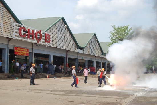 10 giờ sáng ngày 11.5, Ban giám đốc Công ty TNHH QL&KD Chợ nông sản Thủ Đức phối hợp với phòng Cảnh sát phòng cháy chữa cháy (PCCC) Quận 9, tổ chức diễn tập phương án chữa cháy và cứu nạn, cứu hộ tại khu nhà lồng chợ B.